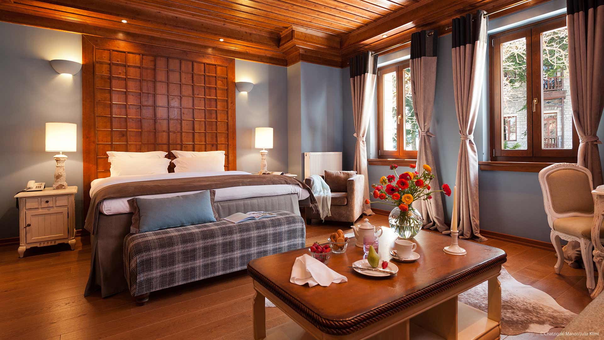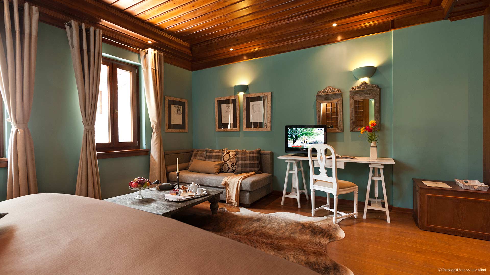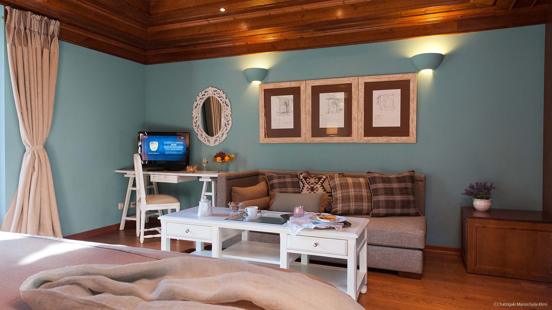 Superior rooms offer a warm ambiance with a slightly modern touch. Approximately 40 square meters in size, they feature wooden ceilings and floors, a marble bath with a bathtub and a shower cabin with water massage, and a sofa- bed sitting area with small table and desk. The king-size, 4-Layer, double Coco-mat bed invite you to relax and dream. The sofa bed in the sitting area has a Coco-mat mattress and is perfect for a child. Suitable for 2 adults and up to 1 child. Some Superior Rooms offer private balconies or verandas.