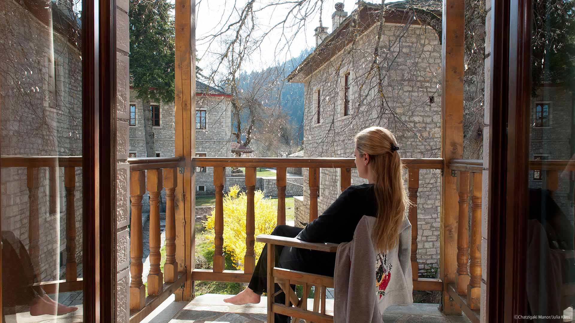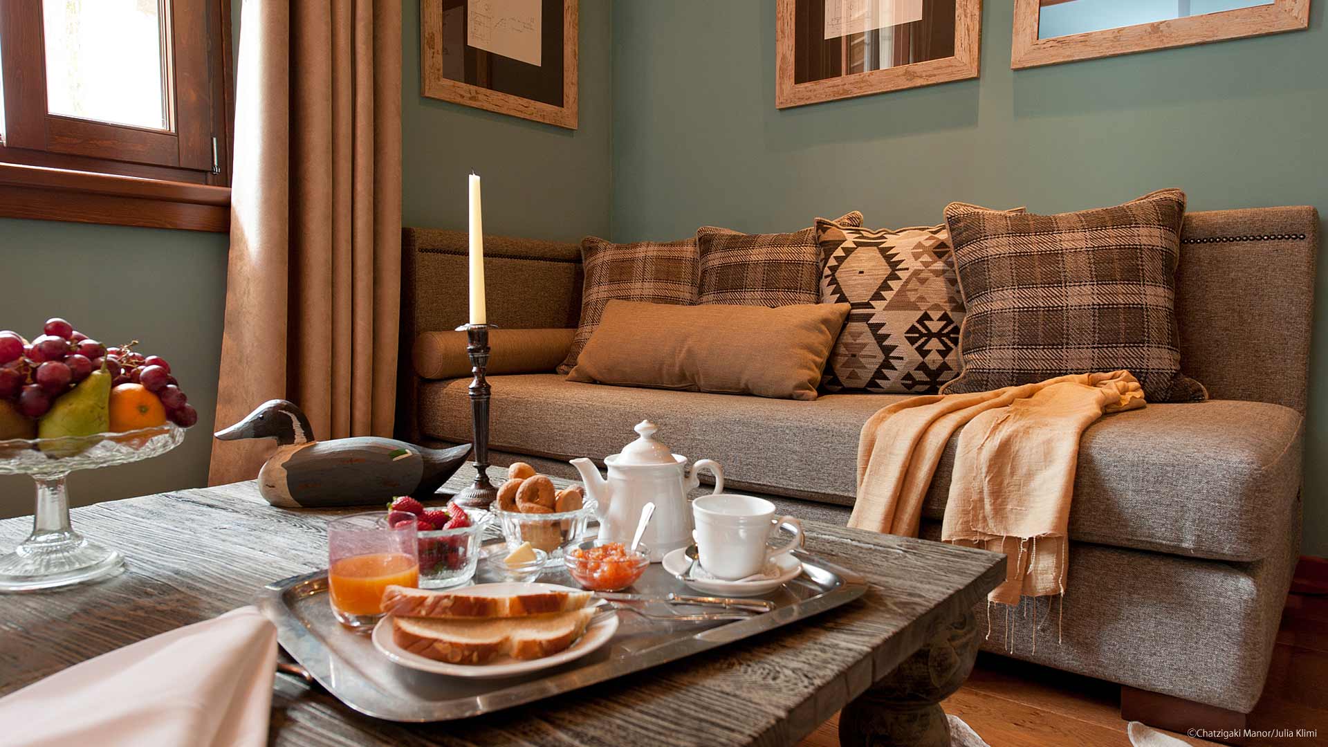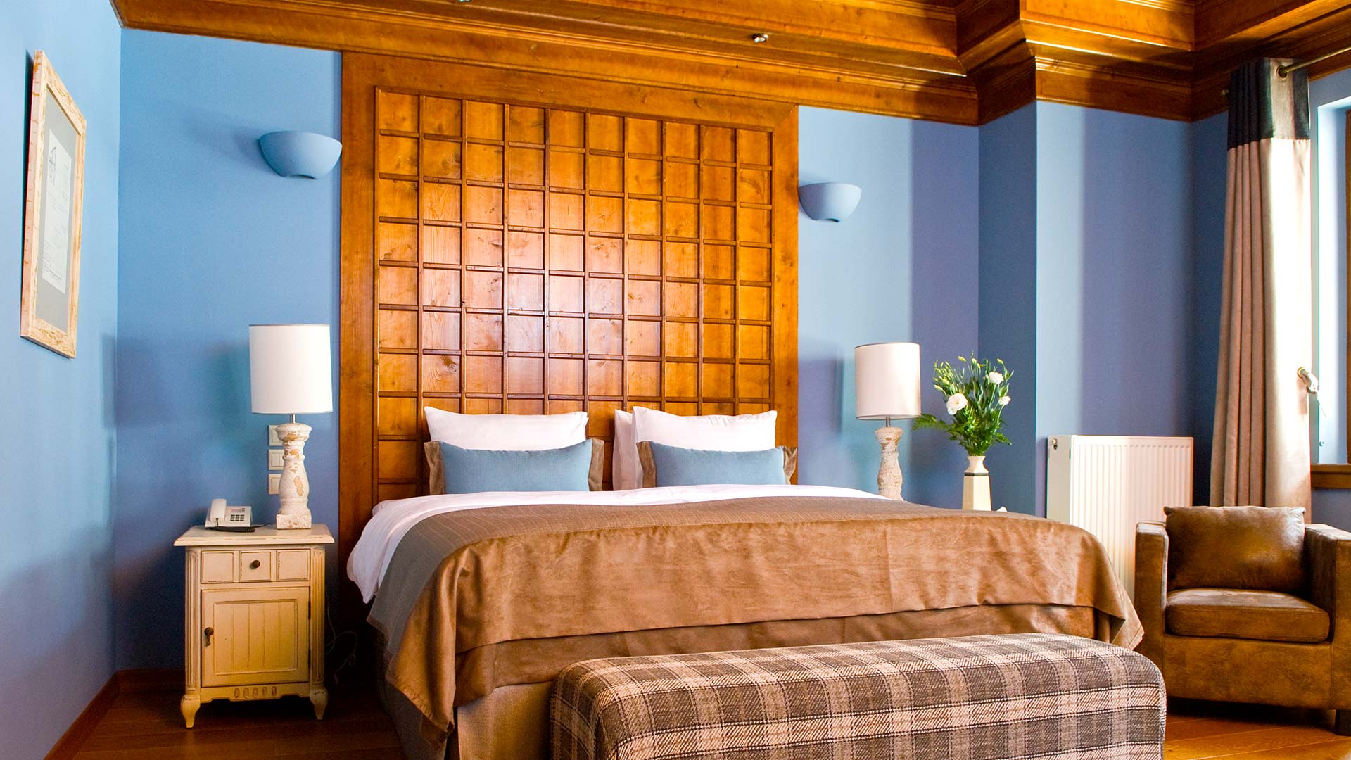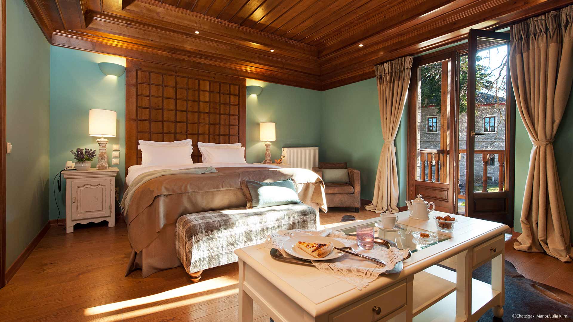 Superior rooms offer a warm ambiance with a slightly modern touch. Approximately 40 square meters in size, they feature wooden ceilings and floors, a marble bath with a bathtub and a shower cabin with water massage, and a sofa- bed sitting area with small table and desk. The king-size, 4-Layer, double Coco-mat bed invite you to relax and dream. The sofa bed in the sitting area has a Coco-mat mattress and is perfect for a child. Suitable for 2 adults and up to 1 child. Some Superior Rooms offer private balconies or verandas.