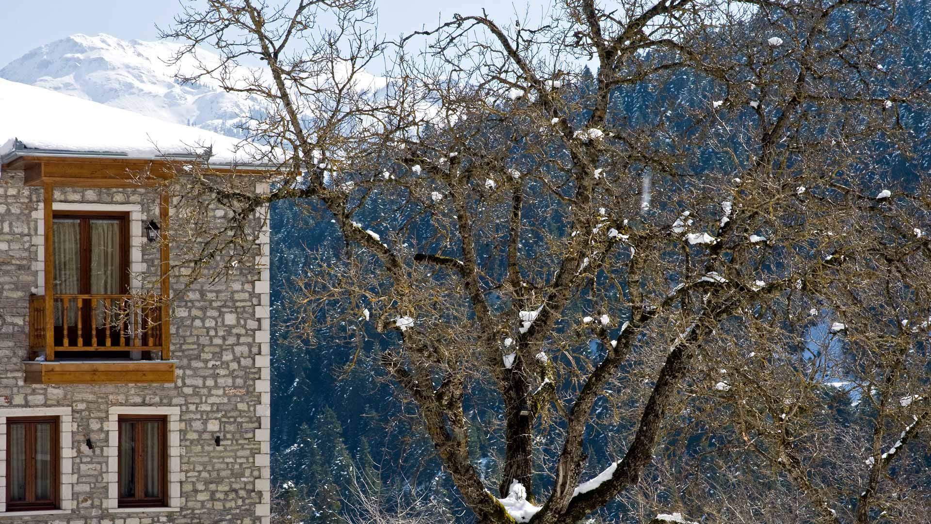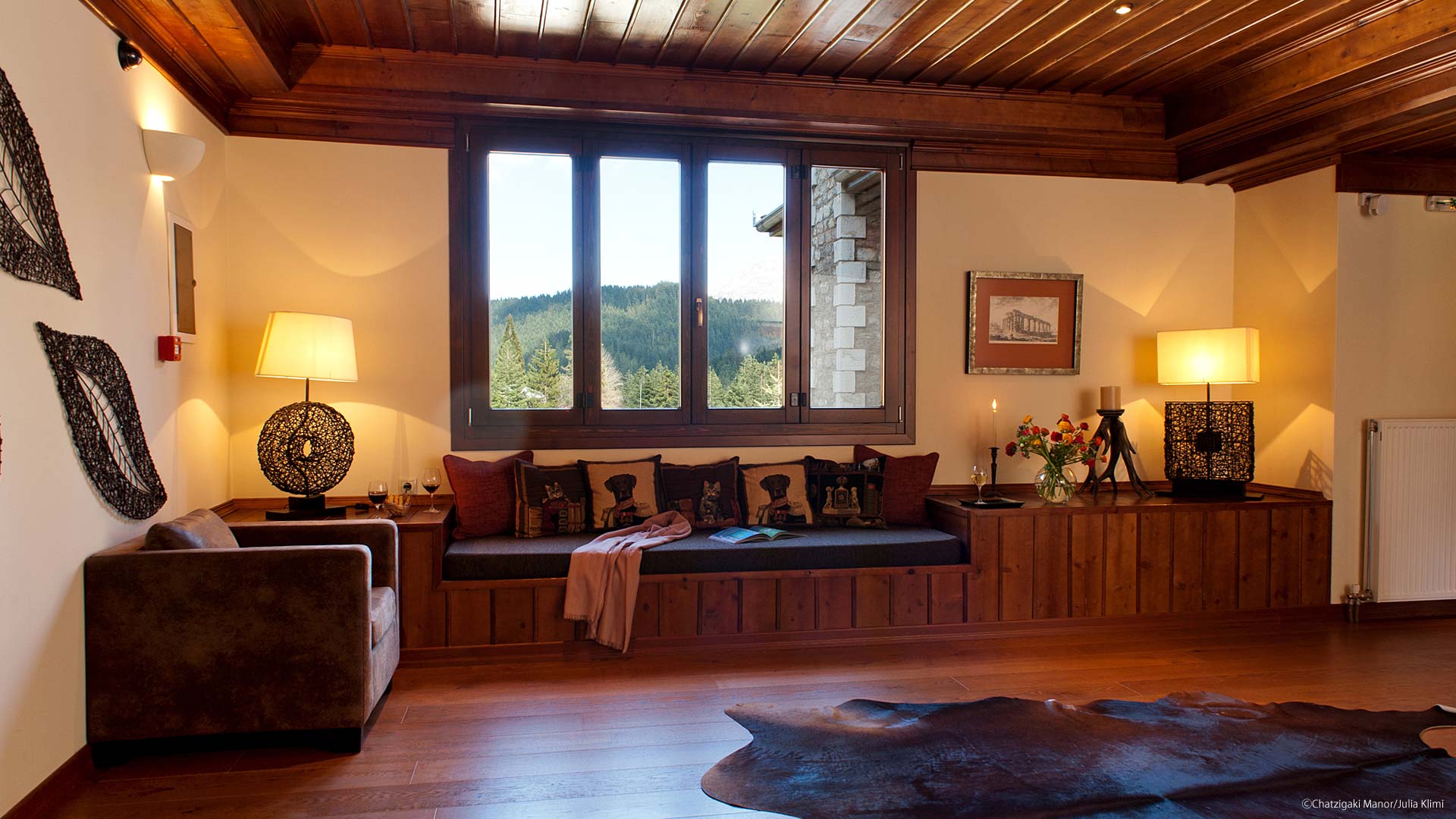 On the upper level is the “Boudoura” restaurant, which was named after the homonymous peak of the mountain. The restaurant is dominated by a large fireplace and has impressive views towards both the opposite mountain and the village of Pertouli. The combination of wood and stone in the floor, the wood-carved ceilings, and the unique aesthetics of the furniture, delicately bestow on the visitor an atmosphere worthy of the surrounding landscape. Breakfast, lunch and dinner are served here.