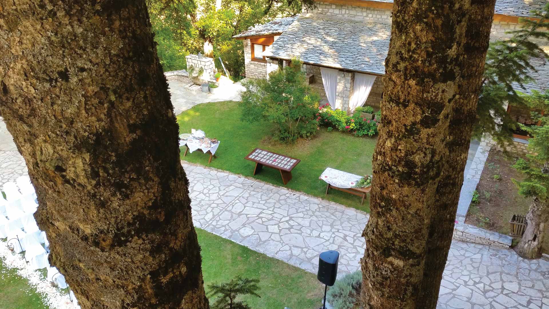Characteristic of the hotel’s outdoor spaces are the stone terraces, decorated with colorful flowers that please the eye in the otherwise monochrome of green. The gardens, combined with the centenarian fir trees that surround the Mansion, the walnut trees, the Italian plum trees, the poplars and the magnificent view of the forest of Pertouli, create an enchanting environment for invigorating holidays and unforgettable receptions.